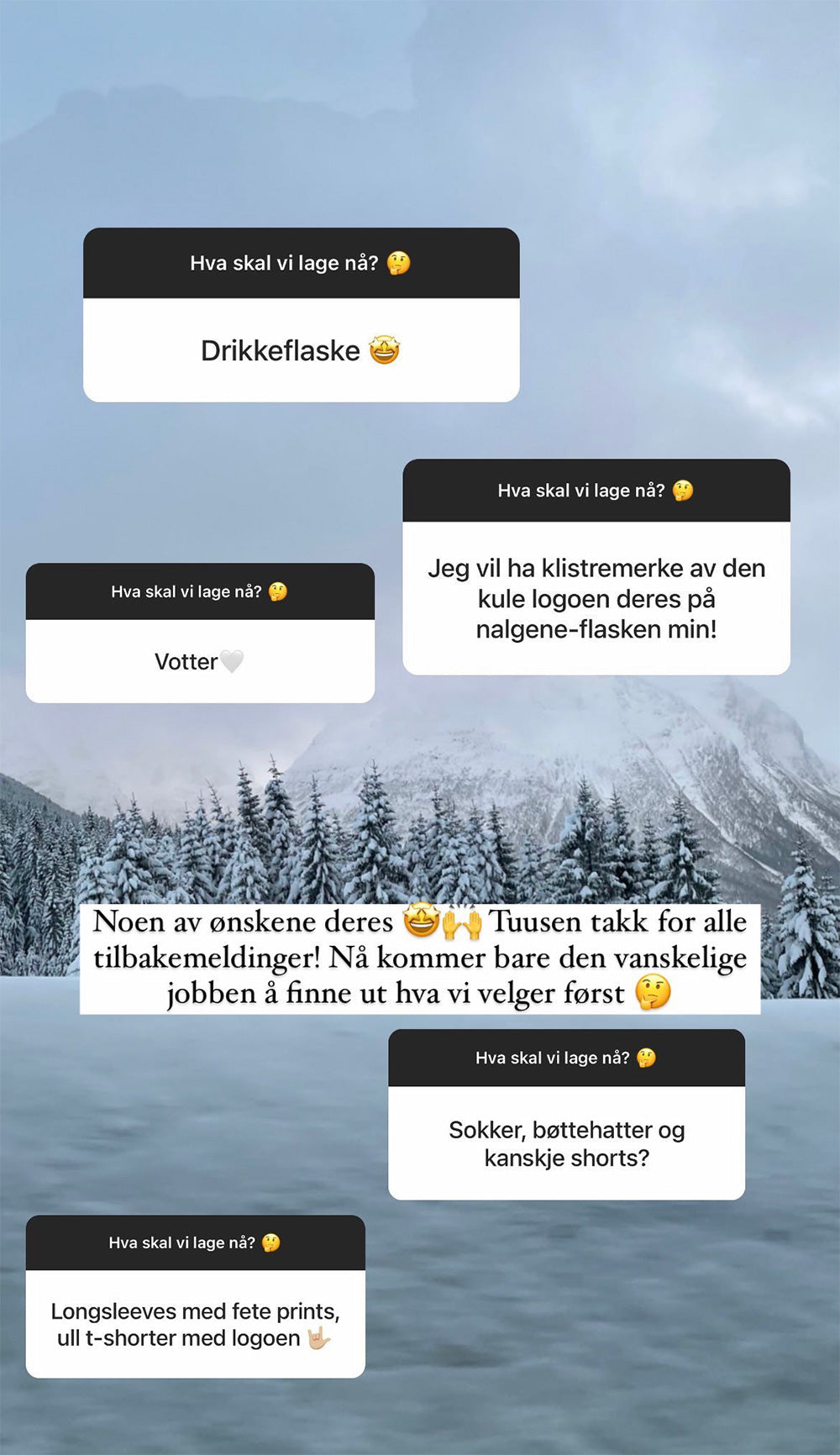 På Instagram lar vi følgerne våre ta del i prosessen rundt skapelsen av nye produkter. Der får dere komme med innspill og ønsker på eksisterende og nye produkter. Gjennom avstemning på design velger vi ut hva som blir produsert. Vi setter sjukt stor pris på alle tilbakemeldinger 💕